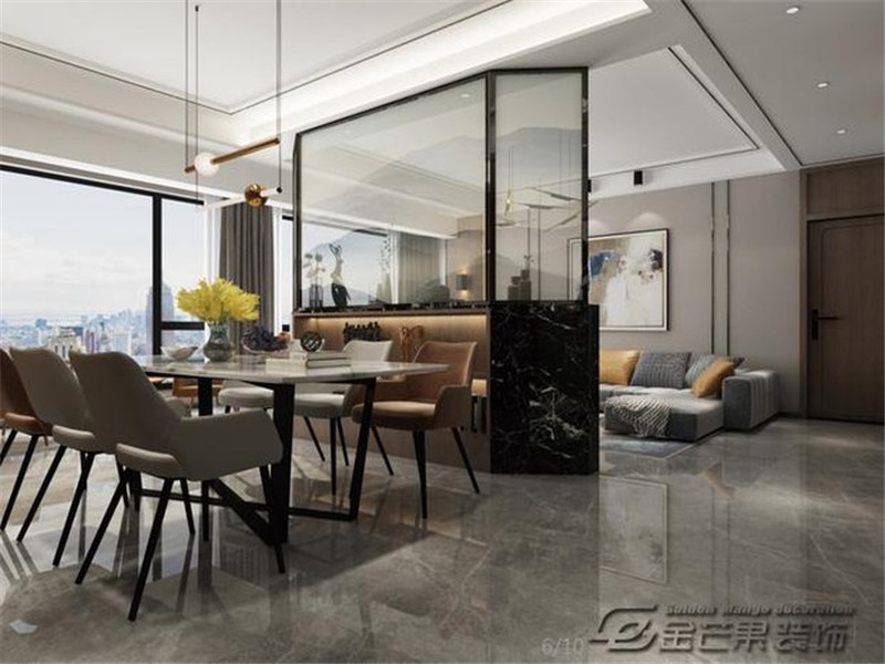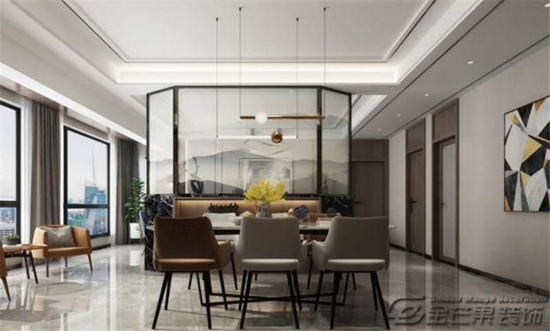 寬大的落地穿窗帶來良好的采光,加上透亮的電視背景墻,意境悠然,在此環境用餐,頗有“而無車馬喧”的意境。