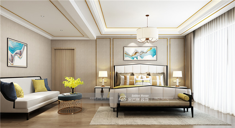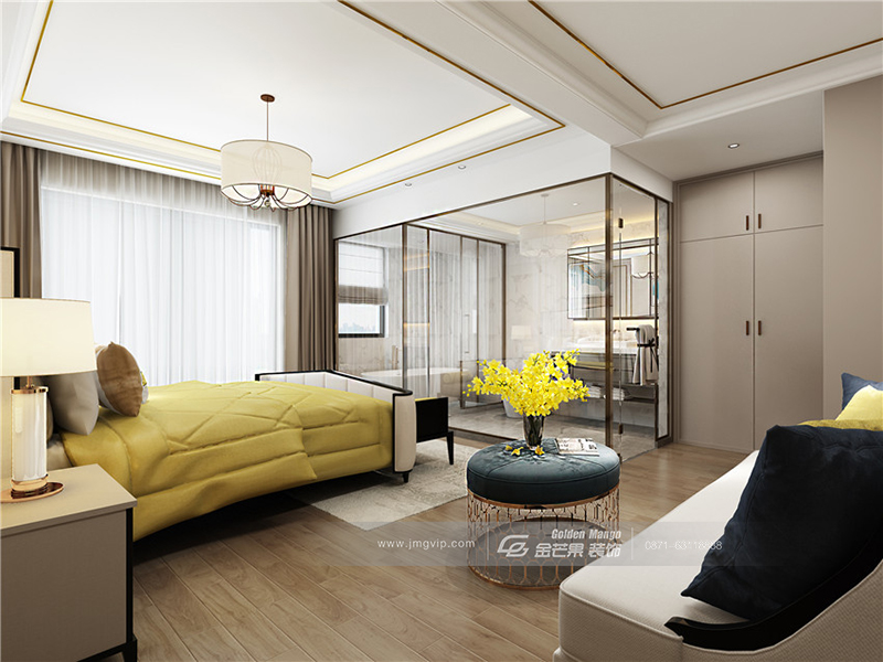 大氣、優雅的象牙白搭配個性得燈飾,用黃色的家居點綴明亮的空間。玻璃柜體時尚、精致有個性,增加房間通透感。