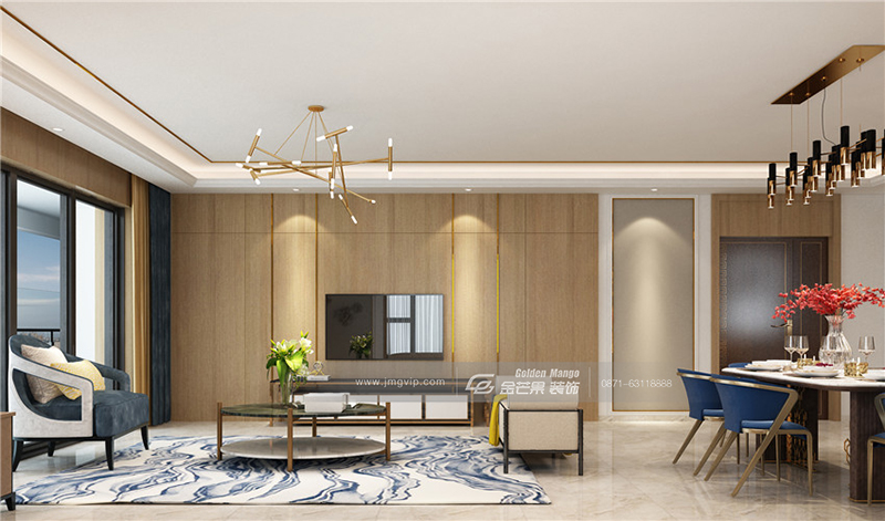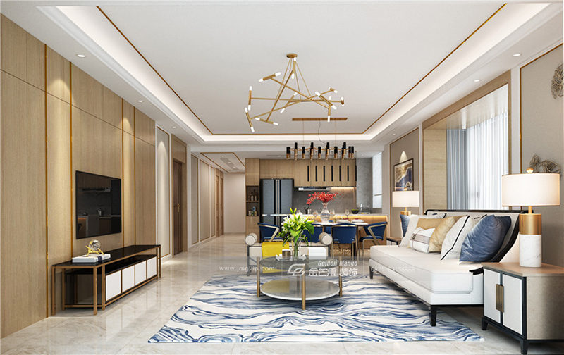整體空間的氣氛是沉靜、優雅的,電視背景墻給人沉穩的感覺。吊燈的金線營造精致、奢華感,搭配鐵藝的家具營造輕奢的氛圍。地毯既起到了點綴作用又營造異域風情。