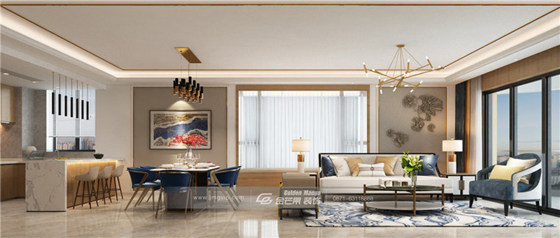 餐廳和廚房是一個開放的區域,高貴、優雅的墨藍色渡邊鑲金,搭配奢華、個性的燈飾,打造一個優雅的用餐空間。靈動的空間開闊、靈動、可用性強。