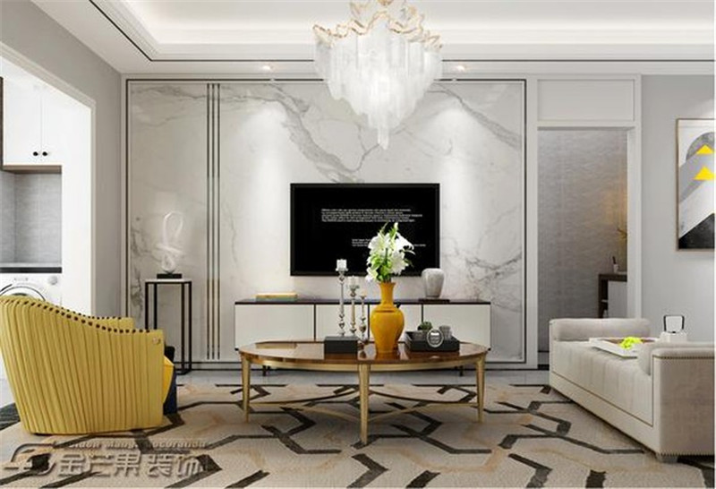 整體灰色的色調經典時尚不易過時,輔以經典的灰色細線條增加空間感。明黃色的沙發椅為空間增添明媚的顏色,而且黃色往往能營造溫馨的家居氛圍。