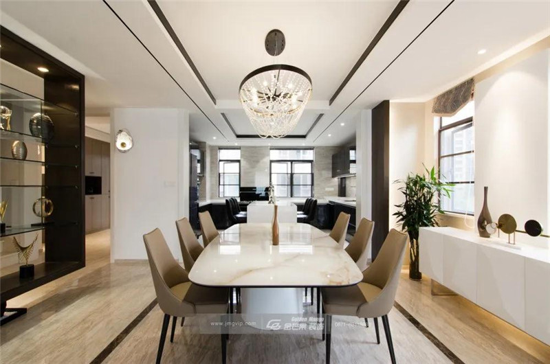 簡約的大理石餐桌椅,和整體空間融入得恰到好處,華麗的吊燈讓用餐變得有儀式感,簡約的氣質(zhì),輕奢的品質(zhì)。