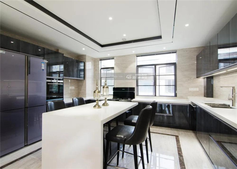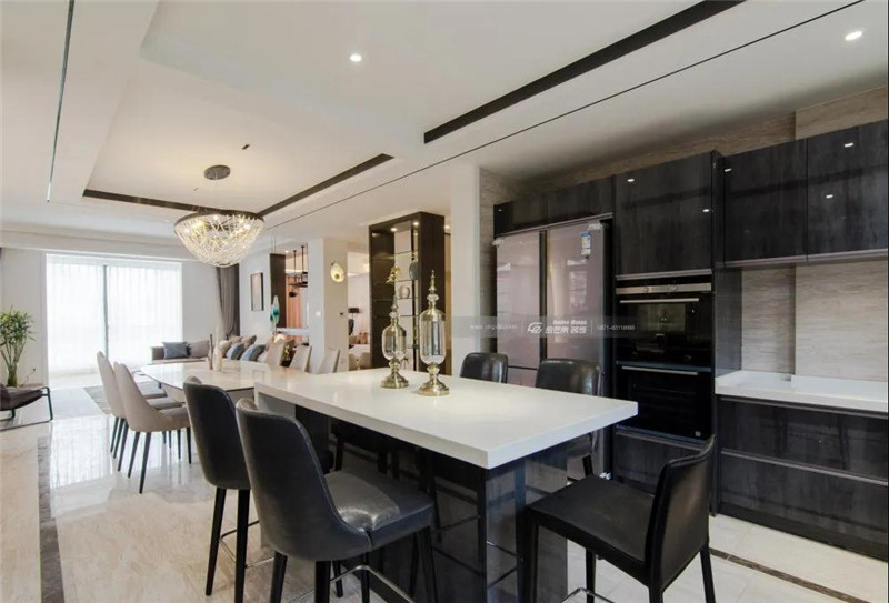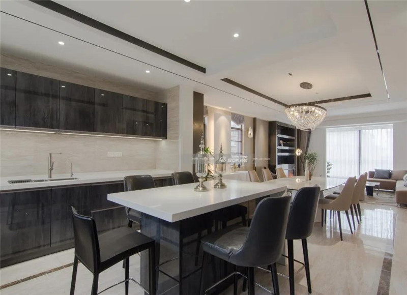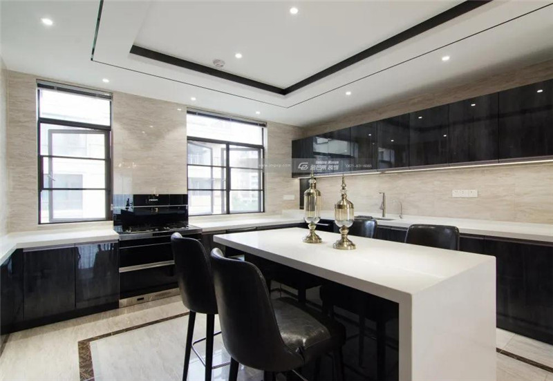 開闊的廚房,同時滿足中西廚配置,為烹飪美食帶來更多的便利。黑色的柜體和吊頂黑色線條呼應(yīng),打造的是一個富有高級感的空間。在如此優(yōu)雅的環(huán)境下,仿佛食物也更加精致起來了。