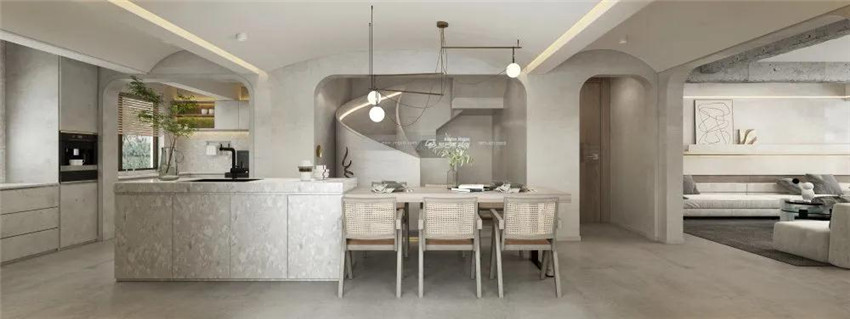 弧形元素在空間中被大量運用,弱化空間棱角。柔和與冷冽的融合。柴米油鹽,人間煙火,看似無色,卻勝過萬千繁雜。