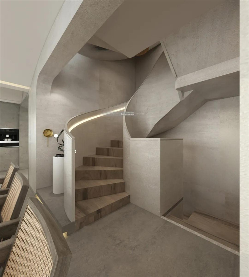 旋轉樓梯,豐富空間層次,帶來視覺縱深感。光在這里扮演著重要的角色,輪廓燈和扶手燈的結合,讓微小細節散發迷人的魅力,增添夢幻般的質感。