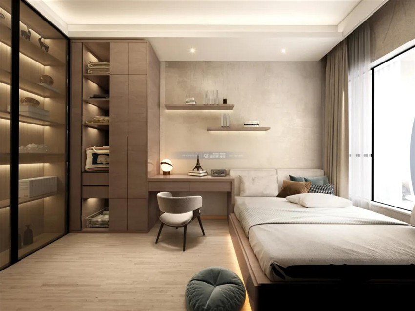 寬敞的空間優勢將浴室、衣帽間納入其中,提升家居品質。延續整體風格的肌理感墻面,沉寂的色調,簡約精致的線條,如清風撲面,肆意灑脫。