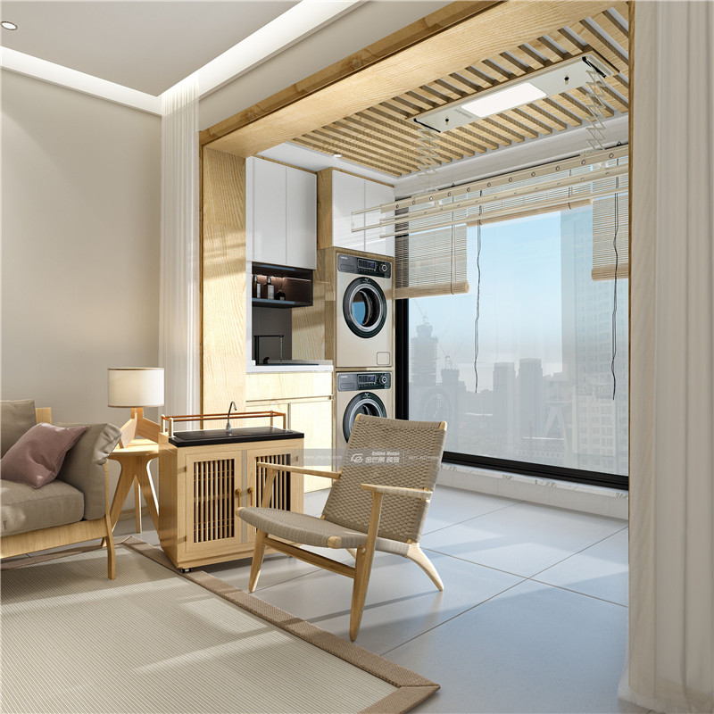 客廳陽臺洗衣機(jī)也是內(nèi)嵌的,很節(jié)省空間。充滿木香氣和陽光的味道混合在一起的香氣,陽臺空間也很愜意哦。