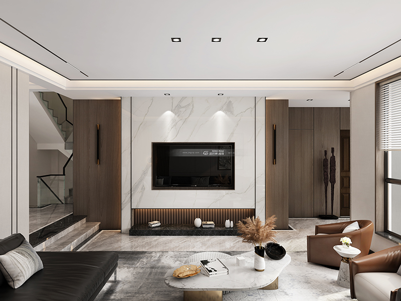 大理石做電視背景墻,高級(jí)大氣,木飾面處理增加品質(zhì)感。