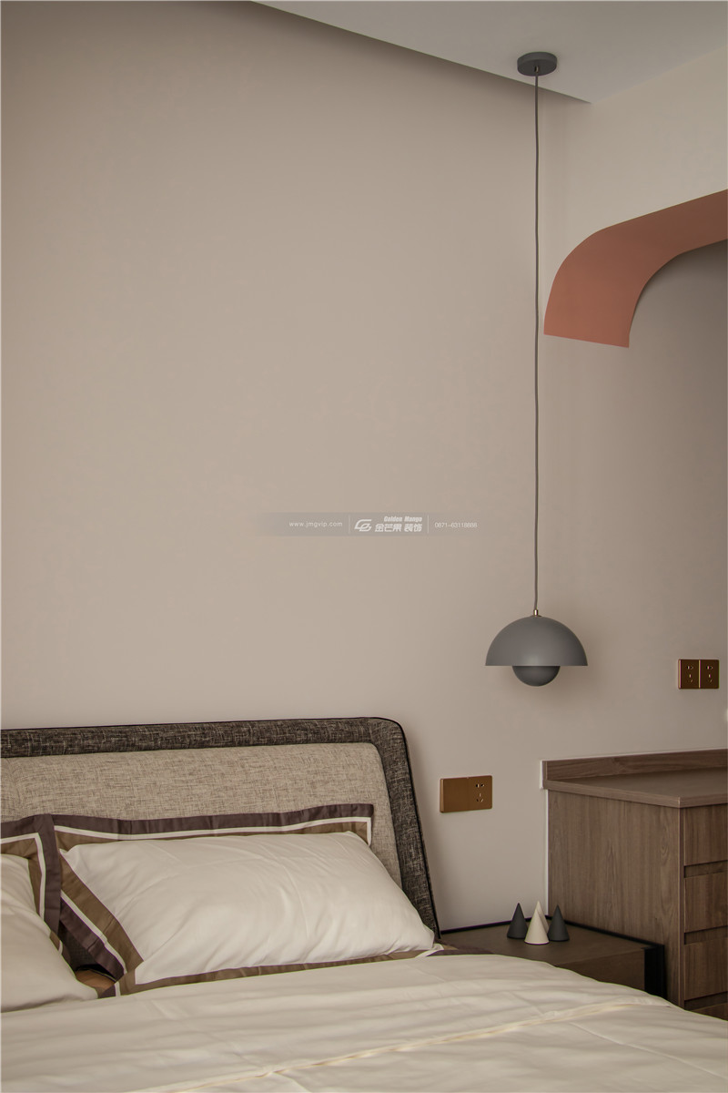 運用拱形的弧度讓空間更顯溫柔,上淺下深的顏色空間感很強,且對比的顏色對比之中展現獨特的家居魅力。地板上的花紋和顏色和整體基調搭配得當,增加活潑、明媚的顏色。溫柔、嫵媚氣質太驚艷了。