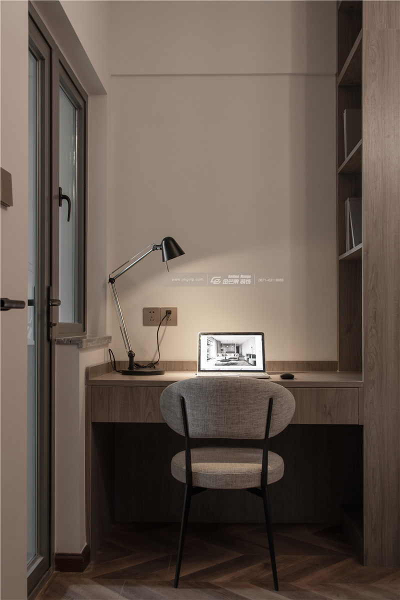 木材的書柜顏色和整體空間呼應,細膩安靜的感覺給屋主一個放松、自在的舒適空間。