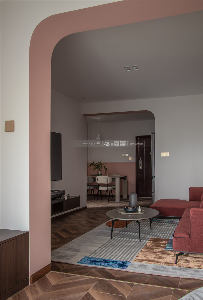 全屋大量運用淺紅色,既有成熟的韻味,也不乏少女的羞澀感。紅色沙發和地板顏色相近,和上面的白墻形成對比,一分為二又和諧共生。線條多運用溫柔的曲線,打造細膩溫柔的感覺。