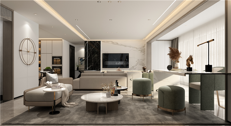 一個(gè)小吧臺(tái)的設(shè)計(jì),客廳的多變、互動(dòng)的空間,即可以作為辦公區(qū)域,又可以作為休閑會(huì)客區(qū)域。