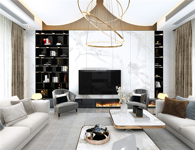黑白灰的高級搭配,大理石電視背景墻和黑色輕奢的柜體,打造層次感。壁爐的加入,更增添了一些溫暖優雅的氣息。灰色沙發和地毯,經典耐看,高級感呈現。