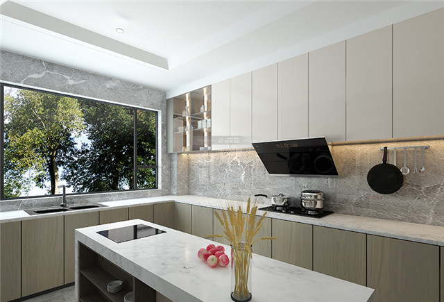 大大的窗子,明亮的氛圍,食物仿佛也有了更加鮮明的顏色。中間設置島臺,同時滿足中西廚烹飪需求,明亮、時尚的空間氛圍。