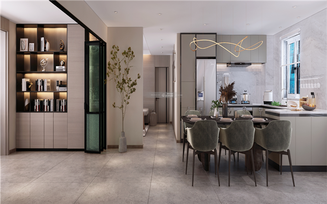 沉靜的氛圍中融入綠色的家居,像一縷清風,又像一杯香醇的茶,細膩優雅,摩登氣質。開放式的廚房讓家居空間更靈活。絨布餐椅帶來低調的華麗感。