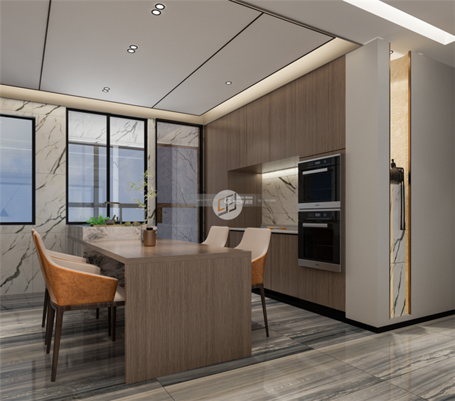 開放式的客餐廳互動(dòng)性更強(qiáng)。木質(zhì)餐桌和櫥柜和整體空間呼應(yīng),點(diǎn)綴橙色座椅增加時(shí)尚質(zhì)感。