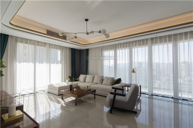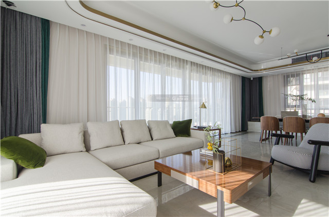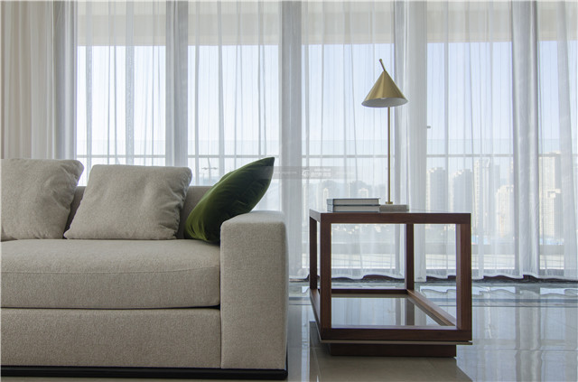 白色棉麻沙發帶來舒適的質感,打造慵懶、愜意的家居氛圍。白色棉麻和超大落地窗搭配白色紗簾, 仙氣飄飄的感覺讓生活也隨之干凈了許多,微風一起,白色紗簾被輕輕吹起,滿屋都是純凈、清新的味道。