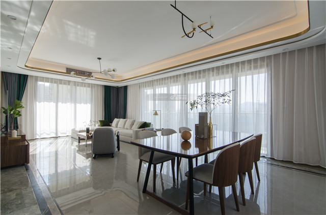 滿屋大面積白色,簡約、干凈,吊頂上用金色的線條點綴打造輕奢感,這種奢而不膩又帶點小清新的味道,清純又迷人。 兩面超大落地窗,視野超好,軟裝上搭配仙氣飄飄的白色紗簾,微風簾動,窗外景色盡收眼底,太愜意了。